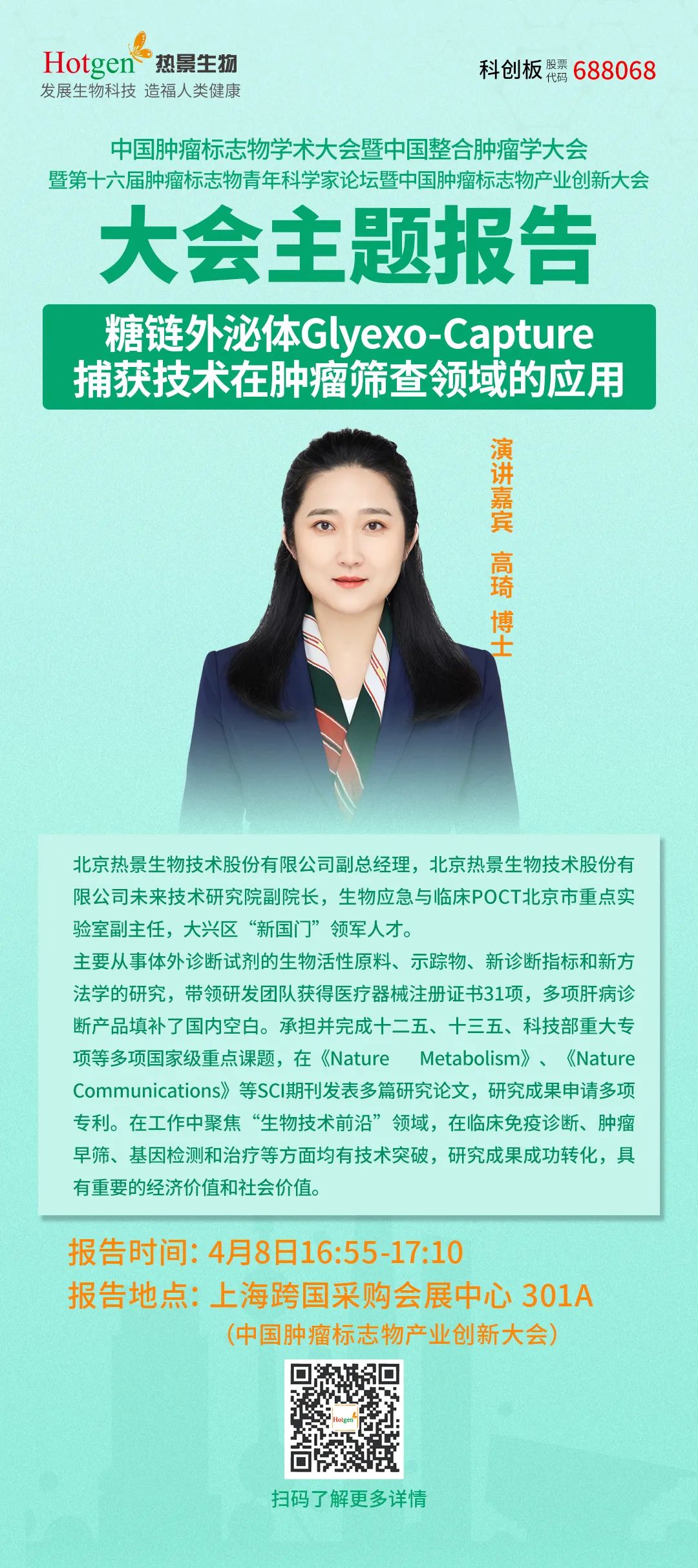4月8日下午,北京熱景生物技術股份有限公司副總經(jīng)理,北京熱景生物未來技術研究院副院長高琦博士受邀在中國腫瘤標志物產(chǎn)業(yè)創(chuàng)新大會分享創(chuàng)新技術報告《糖鏈外泌體Glyexo-Capture捕獲技術在腫瘤篩查領域的應用》。