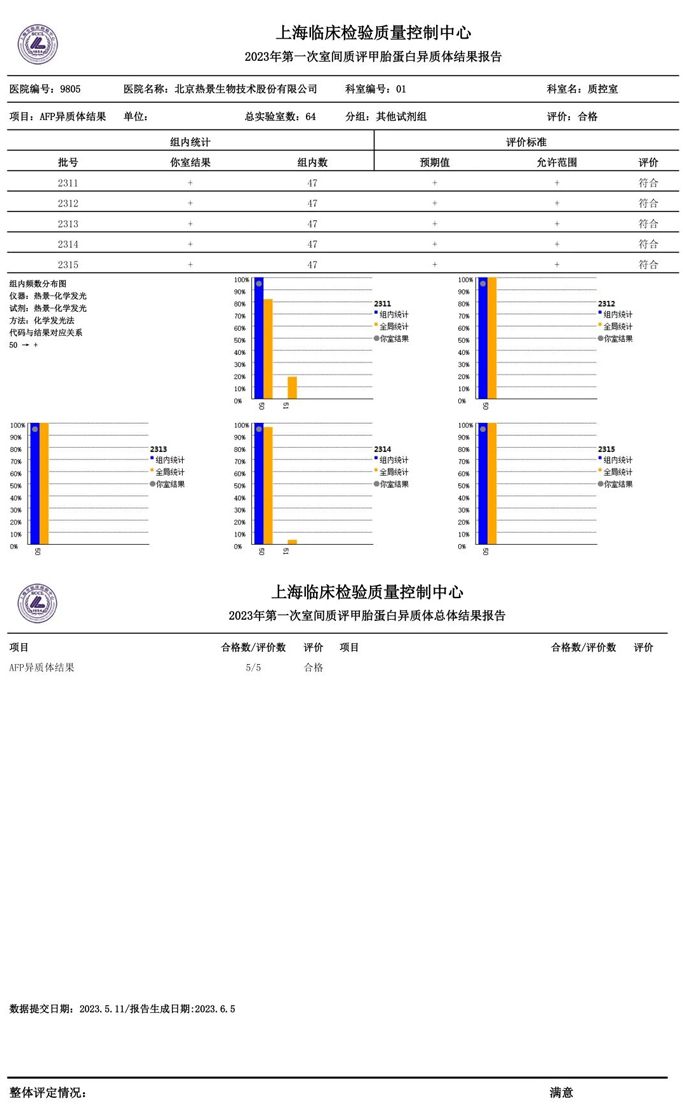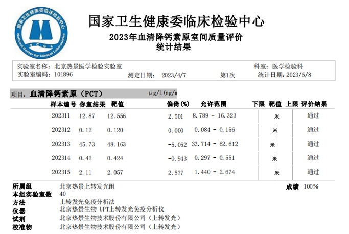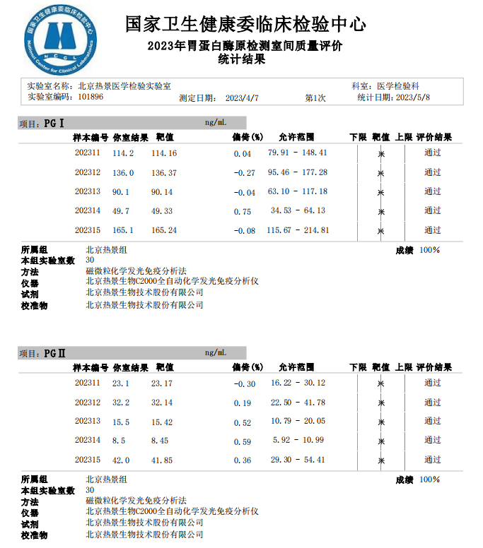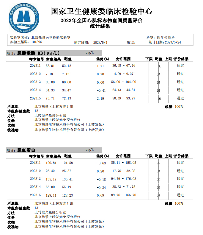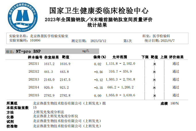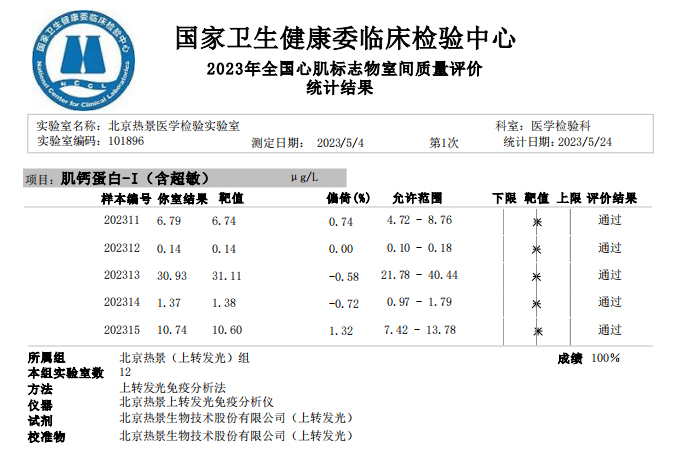 近日,國(guó)家衛(wèi)生健康委臨床檢驗(yàn)中心(NCCL)公布了2023年多項(xiàng)全國(guó)臨床檢驗(yàn)室間質(zhì)量評(píng)價(jià)結(jié)果。熱景生物旗下熱景醫(yī)學(xué)檢驗(yàn)實(shí)驗(yàn)室以100分的優(yōu)異成績(jī)通過(guò)“胃蛋白酶原”“血清降鈣素原”“N末端前腦鈉肽”“心肌標(biāo)志物”等室間質(zhì)評(píng)項(xiàng)目。同時(shí),熱景生物參與的上海市臨床檢驗(yàn)中心2023年第一次能力驗(yàn)證項(xiàng)目,包括B型鈉尿肽/N端-B型鈉尿肽前體、AFP異質(zhì)體比率、肌鈣蛋白I、降鈣素原等項(xiàng)目均通過(guò)驗(yàn)證,充分彰顯了熱景生物穩(wěn)定可靠的實(shí)驗(yàn)室質(zhì)量管理和檢測(cè)能力,以及強(qiáng)大的產(chǎn)品和技術(shù)實(shí)力!