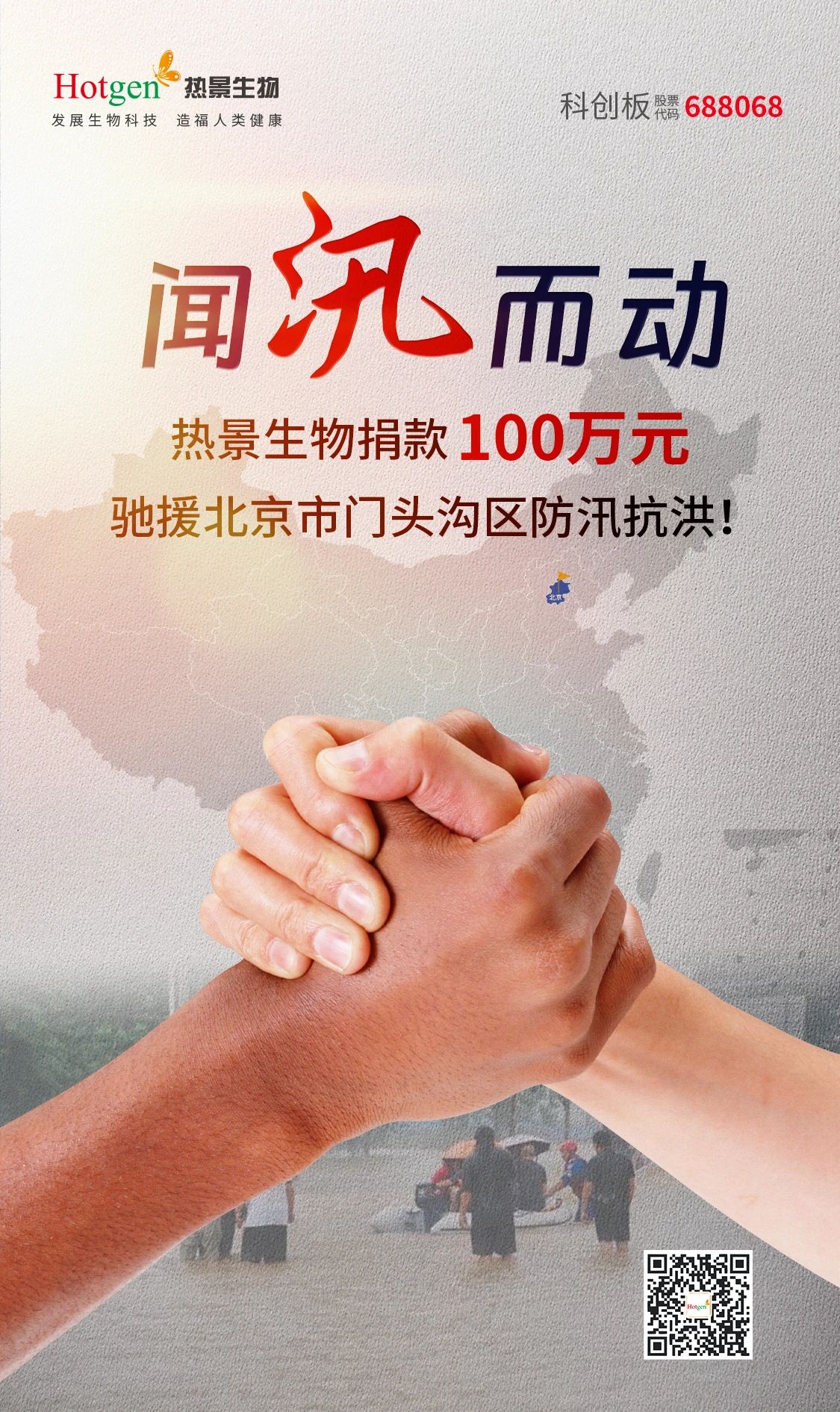 熱景生物一直密切關注著汛情救援進展,主動聯(lián)系相關部門提供支援幫助,并向北京市門頭溝區(qū)紅十字會捐贈100萬元防汛抗洪資金,助力當?shù)卣蜕鐣α靠箵魹那椤?/span>