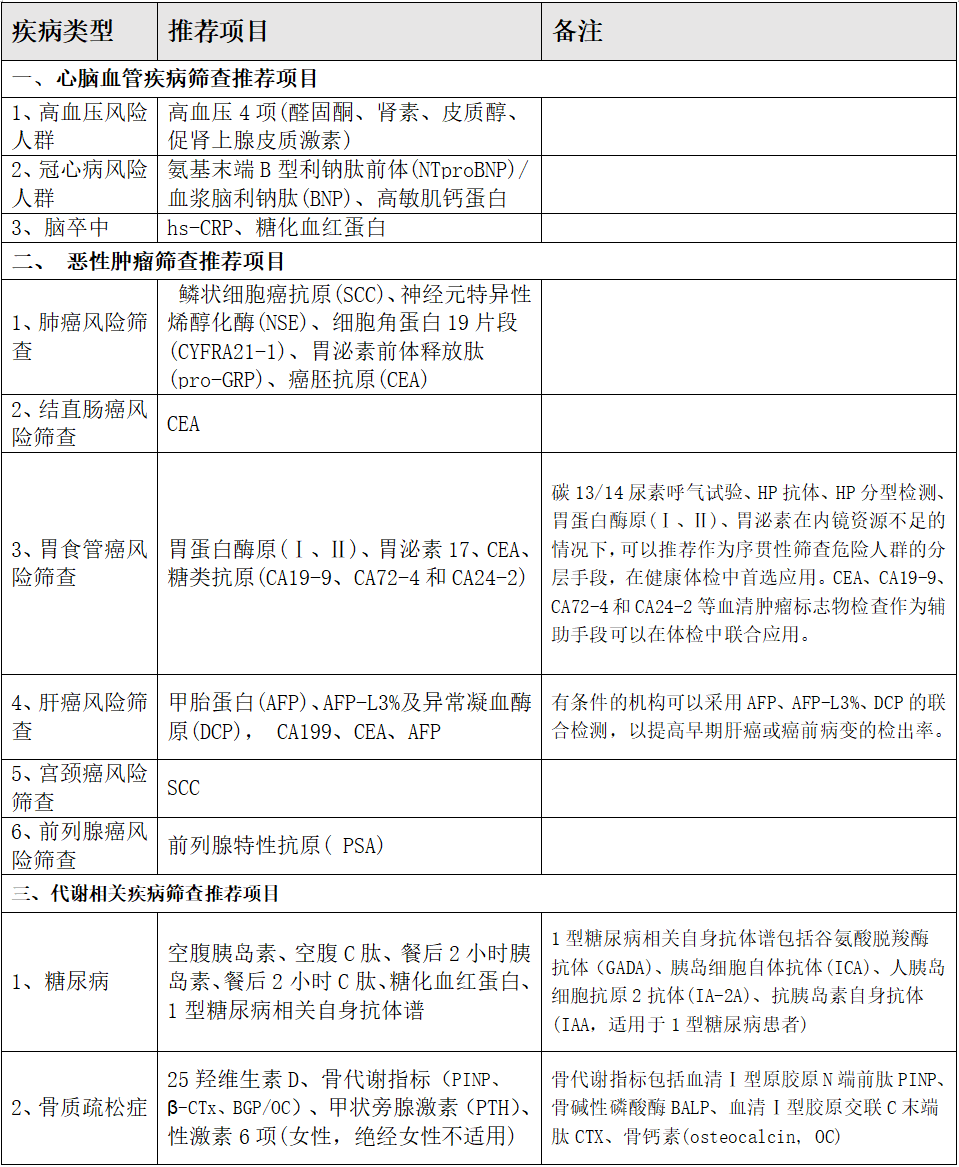 《健康體檢與管理》雜志編委會(huì)聯(lián)合北京醫(yī)學(xué)會(huì)健康管理學(xué)分會(huì)等學(xué)術(shù)組織,匯聚了全國(guó)健康體檢與管理機(jī)構(gòu)80余位知名專家的意見(jiàn)建議,制定了成人個(gè)體化健康體檢基本項(xiàng)目和常見(jiàn)慢性病篩查體檢項(xiàng)目的推薦清單,形成《成人個(gè)體化健康體檢項(xiàng)目推薦專家共識(shí)》,已于近期發(fā)布。針對(duì)常見(jiàn)病和慢性病的健康體檢項(xiàng)目推薦清單,熱景生物多個(gè)項(xiàng)目獲得推薦(表1)。