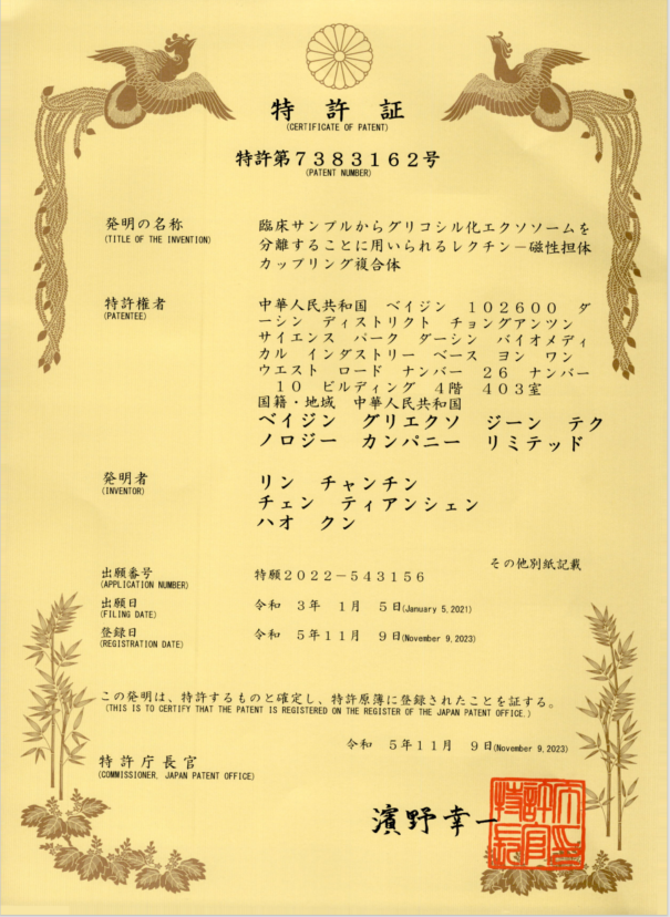 近日,熱景生物自主研發(fā)的糖鏈外泌體技術(shù)GIyExo一Capture平臺(tái)通過PCT途徑獲得日本發(fā)明專利授權(quán),標(biāo)志著糖基化外泌體進(jìn)入國際臨床診斷領(lǐng)域又邁出了具有里程碑意義的重要一步。