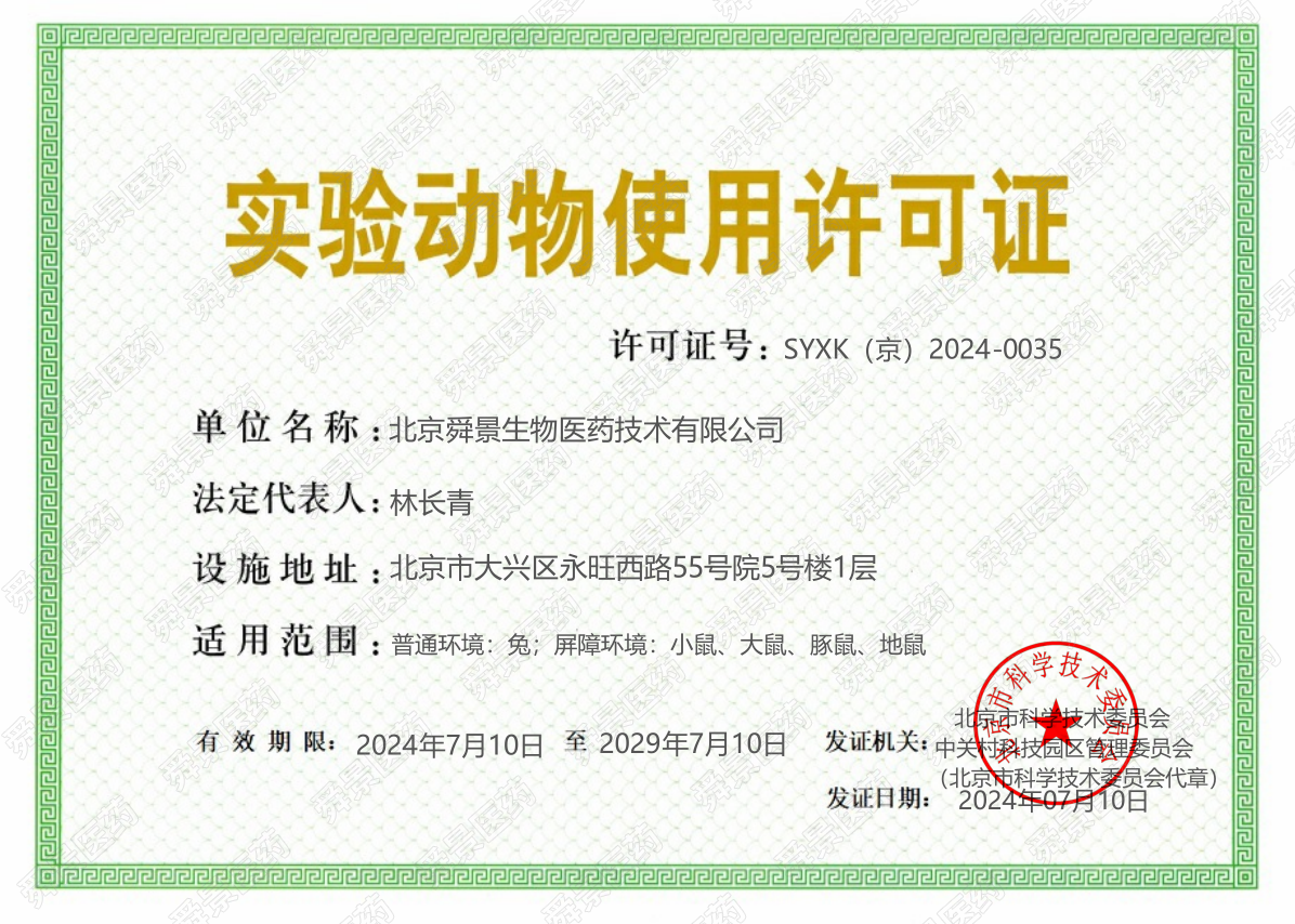 舜景醫(yī)藥實驗動物管理中心位于北京市大興區(qū)生物醫(yī)藥基地慶豐西路55號院5號樓,占地面積約1100平方米,其中屏障環(huán)境約380平方米、普通環(huán)境120平方米,可開展SPF級大鼠、小鼠、豚鼠、地鼠及普通實驗兔的動物實驗研究,設(shè)計大、小鼠籠位共2300余籠。該動物管理中心已搭建了小動物手術(shù)平臺、小動物活體成像平臺、CDX、PDX模型平臺等多個技術(shù)服務(wù)平臺,配備了先進的動物實驗儀器設(shè)備,包括小動物活體成像系統(tǒng)、小動物麻醉機、動物體視顯微鏡等,可滿足不同學(xué)科高水平的動物實驗需求。