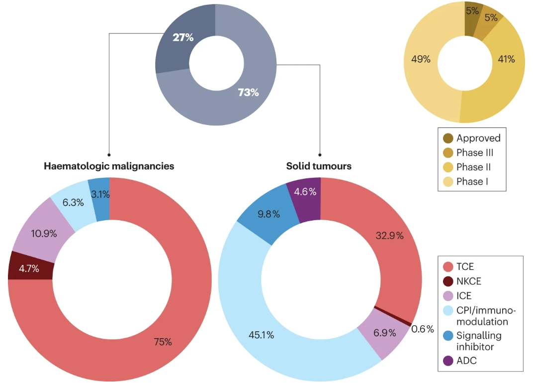 目前,有300多項臨床試驗涉及200多種不同的雙特異性抗體分子,其中約75%用于治療實體瘤,25%用于治療血液系統(tǒng)惡性腫瘤。有10種bsAb藥物已被批準(zhǔn)用于癌癥治療,其中9種在美國和/或歐洲獲得批準(zhǔn),cadonilimab在中國獲得批準(zhǔn)。到目前為止,臨床中開發(fā)的很大一部分bsAbs已經(jīng)處于后期階段(II期和III期)。另外,可以發(fā)現(xiàn),治療實體瘤的bsAbs主要由免疫調(diào)節(jié)劑主導(dǎo),包括雙CPI(約45%)和TCE(約33%),其次是靶向雙途徑、ICEs和ADC的bsAb。